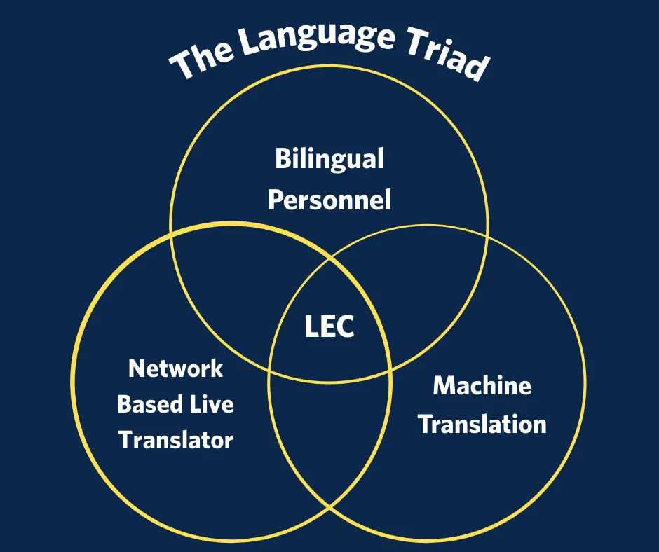 Pour relever ce défi de front, les responsables de la sécurité publique ont besoin d'une solution complète. C'est là qu'intervient la Language Services Triad™. Il s'agit d'une approche en trois parties visant à favoriser une communauté linguistiquement équipée (LEC) :