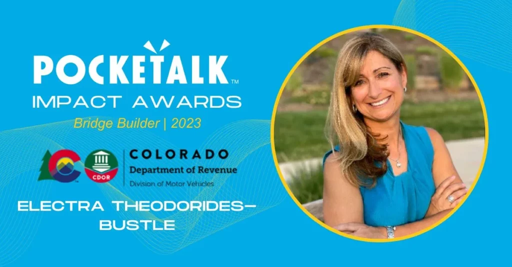 Electra Theodorides-Bustle, directrice principale de l'Agence européenne pour la sécurité et la santé au travail (ESA), a été nommée directrice générale de l'ESA. Division des véhicules à moteur du ColoradoLe prix Bridge Builder lui a été décerné pour le travail exceptionnel qu'elle a accompli en facilitant des conversations fructueuses entre des groupes divers. Sous sa direction, le Colorado DMV est devenu un leader mondial en matière de service à la clientèle et de communication. Grâce aux appareils Pocketalk, le DMV communique désormais avec ses clients dans plus de 85 langues, en fournissant des services de traduction et d'interprétation en temps réel. Cette utilisation innovante de la technologie a permis l'inclusion et une communication efficace, en comblant les lacunes linguistiques et en améliorant l'expérience globale du DMV.