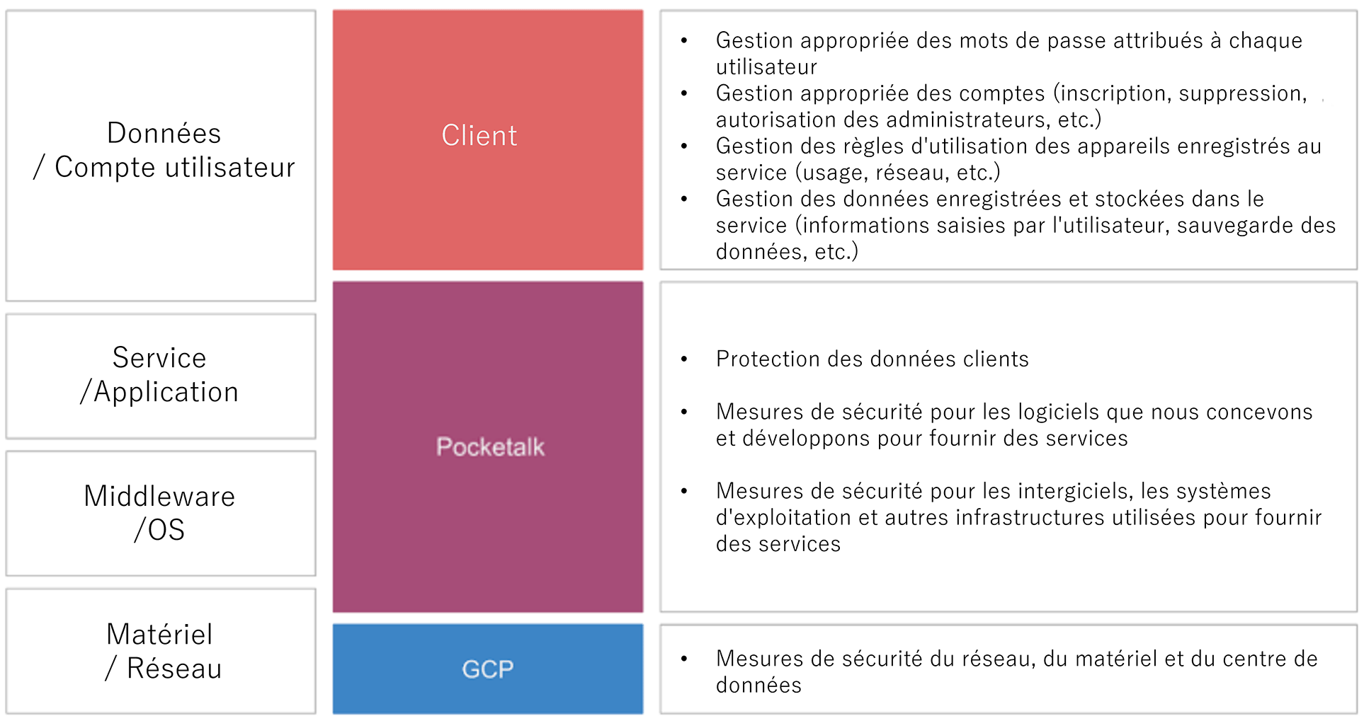 Le partage et la répartition des rôles et des responsabilités dans l’environnement de cloud computing seront tels que stipulés dans “3. Limite de responsabilité entre Pocketalk et les clients Ventana.”